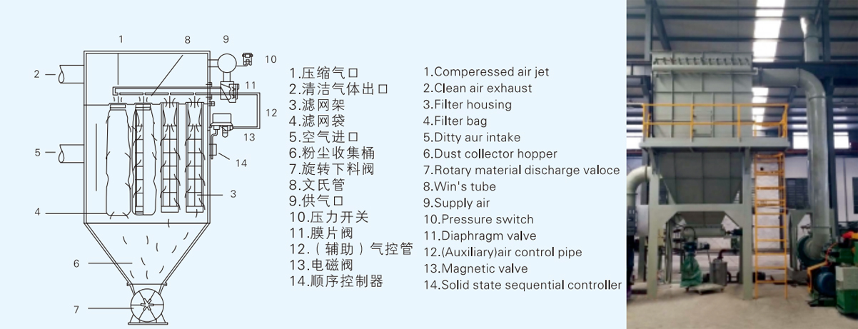 产品简介:原理含尘气流从进气口进入下箱体后,部分沉淀,轻微粉尘浮动时被滤袋阻留,经文氏管进入上箱体,从出气口排出。积附在滤袋外壁的粉尘不断增加,在限定的阻力范围内,应该清除积附在滤袋外壁的粉尘,清灰是由控制仪定期顺序触发各控制阀,使气包内的压缩空气由喷嘴孔喷出(…